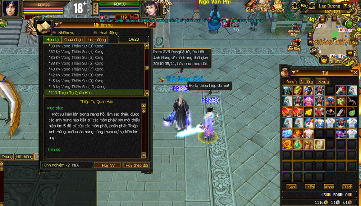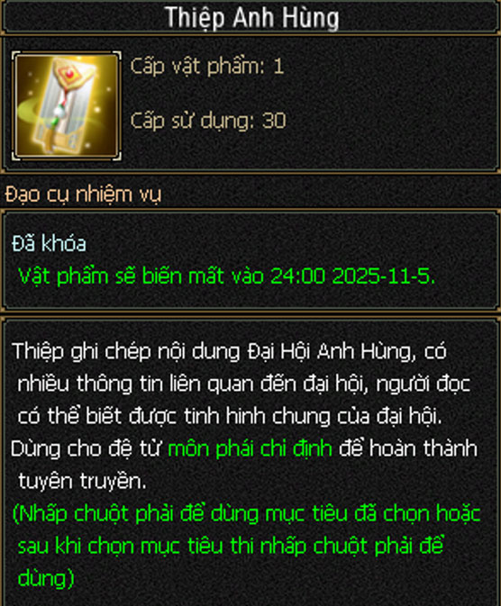 - Dựa theo thông tin trong bảng theo dõi nhiệm vụ, tìm gặp các đại hiệp khác đúng với môn phái yêu cầu, sử dụng Thiệp Anh Hùng để truyền tin hoàn thành nhiệm vụ.