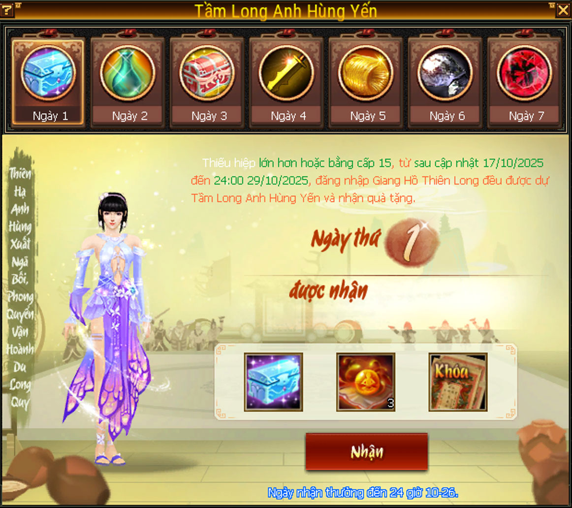 - Trong thời gian hoạt động, đăng nhập vào game mỗi ngày đều nhận được quà thưởng hấp dẫn.