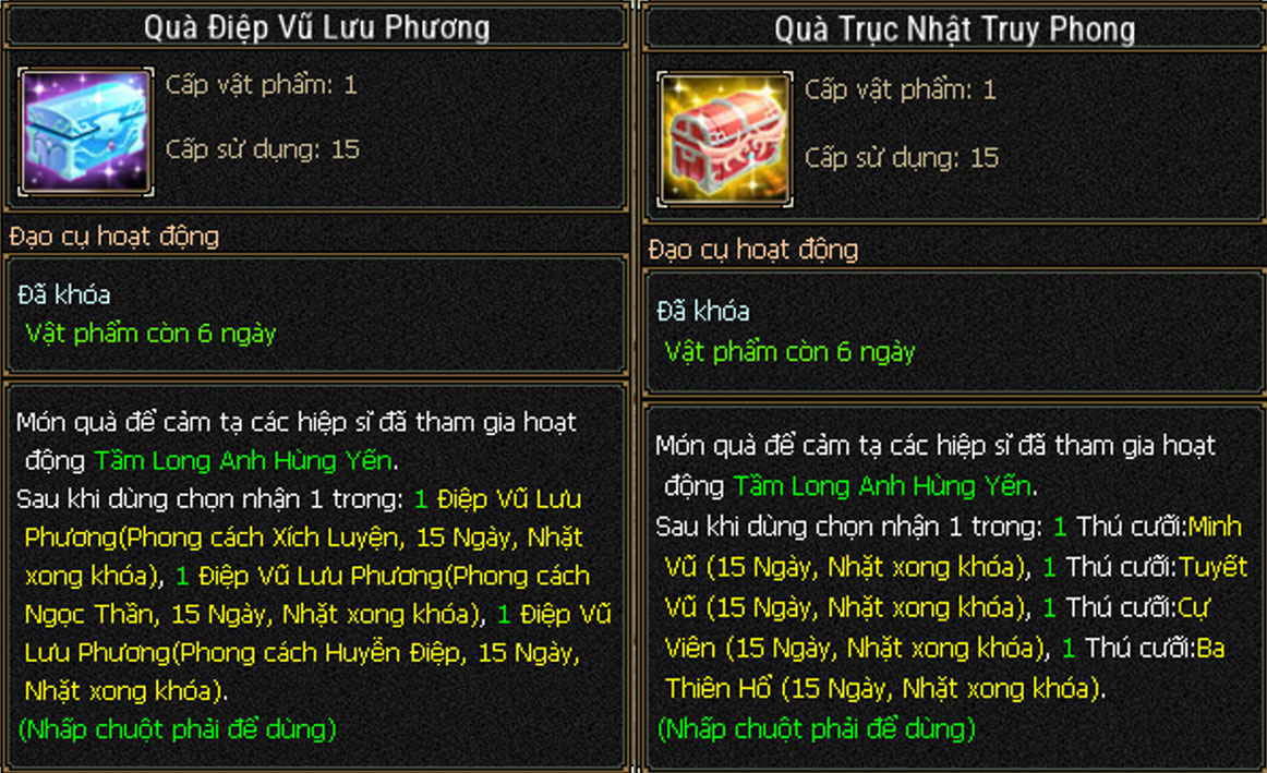 - Lưu ý: Các vật phẩm nhận được ở trạng thái Khóa.