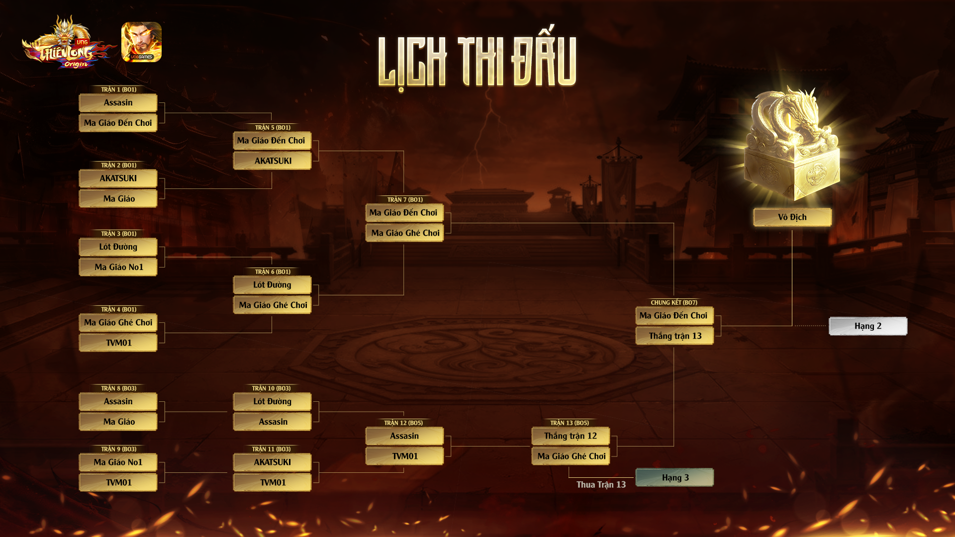 Vào ngày 14/09/2025 vừa qua, giải đấu Thiên Long Chiến Bá tại server Phục Hổ Quyền đã diễn ra theo kết hoạch với kết quả như sau, thân mời đạo hữu cùng xem sơ đồ thi đấu và một số hình ảnh trong đấu trường dưới đây.