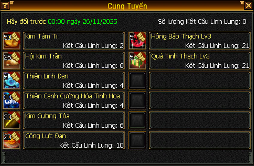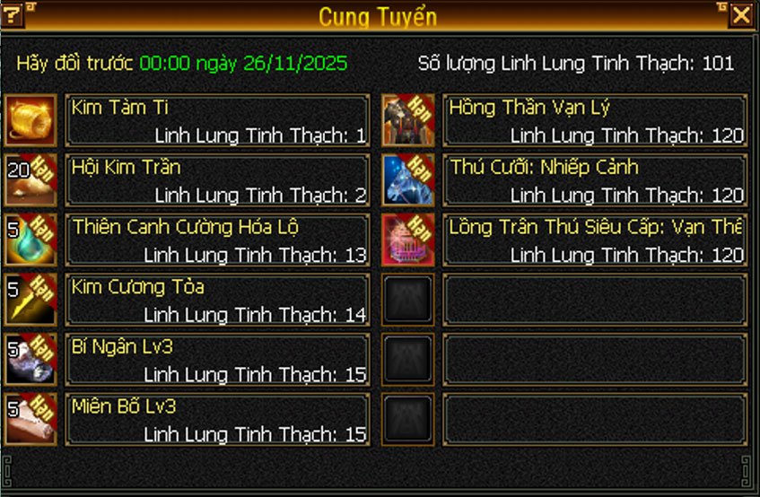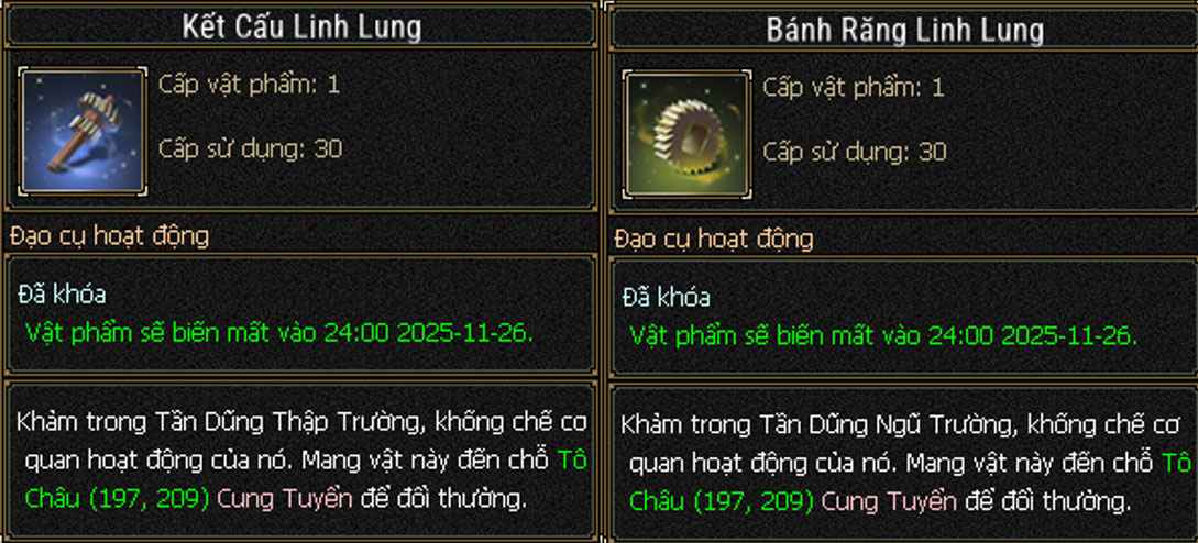 - Kết Cấu Linh Lung, Bánh Răng Linh Lung, Linh Lung Tinh Thạch đều có thời hạn sử dụng đến hết 26/11/2025, do đó cần đem đổi vật phẩm trước khi chúng bị biến mất khi hết hạn.