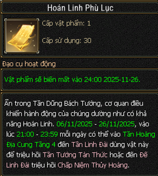 - Riêng đối với Hoán Linh Phù Lục, đây là vật phẩm triệu hồi đặc biệt, dùng cho giai đoạn kế tiếp.