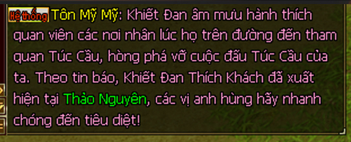 - Trong Hội Đấu Túc Cầu, tổ đội tiến hành đánh bại Tôn Mỹ Mỹ, Tôn Mỹ Mỹ sẽ thông tin cho toàn bộ các đại hiệp trong giang hồ về tin tức của bọn Khiết Đan Thích Khách tại bản đồ dã ngoại.