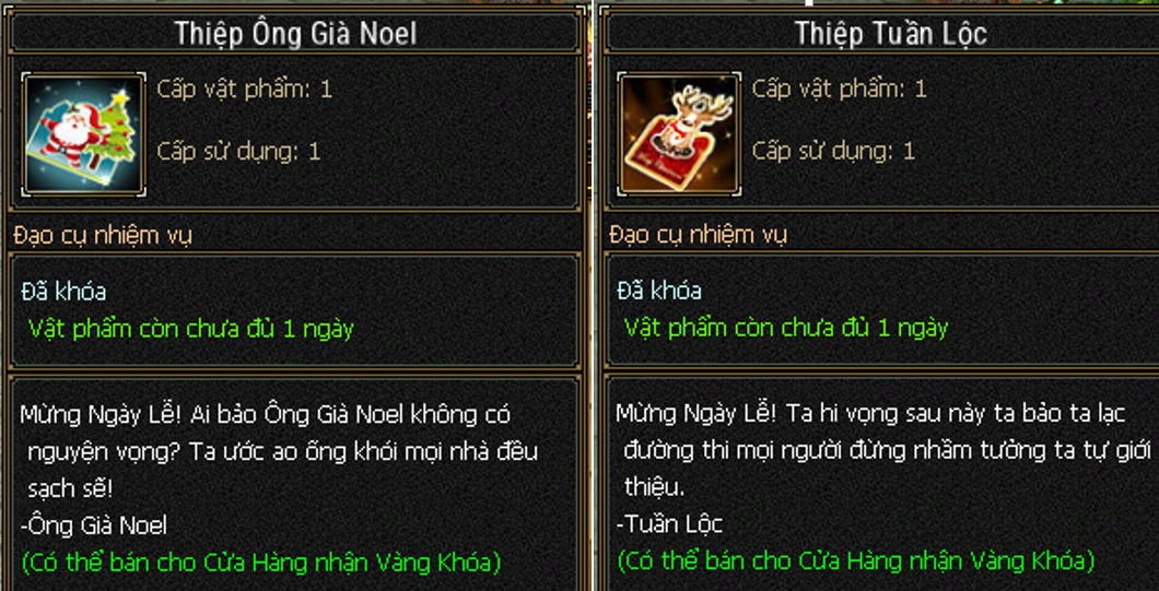 - Phần thưởng Kỳ Ngộ Cây Thông (Bán vào tiệm để nhận Vàng Khóa)