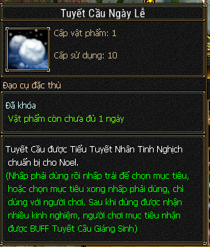 | Tuyết Cầu Ngày Lễ | Dùng với người khác để nhận EXP, người đó sẽ nhận được BUFF Tuyết Cầu Giáng Sinh |