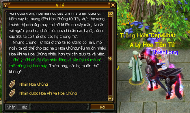 - Nhân vật cấp 30 trở lên có thể đến đối thoại với NPC A Lý để nhận nhiệm vụ Trồng Hoa Được Hoa.