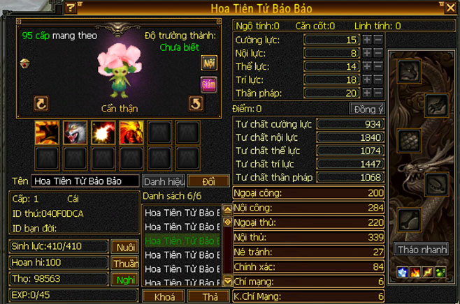 - Trân thú Hoa Tiên Tử Bảo Bảo có ngoại hình đáng yêu cùng với các kỹ năng mạnh mẽ hữu ích cho các đại hiệp trên con đường chinh phục giang hồ.
