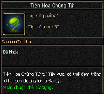 - Hạt giống hoa khi nhận có thể tiến hành gieo hạt (nhấp chuột phải để sử dụng) tại Đại Lộ Đông Tây của thành Đại Lý.