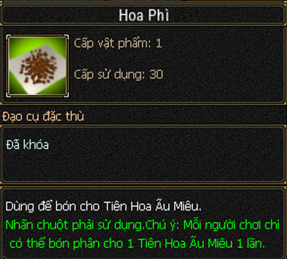 - Tiến hành sử dụng Hoa Phì (nhấp chuột phải sử dụng lên mục tiêu đã chọn) để bón phân cho Hạt mầm.