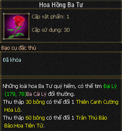 - Riêng Hoa Hồng Ba Tư, các đại hiệp có thể đến gặp Ba Cái Lý tại thành Đại Lý (178,78) để tiến hành đổi được nhiều vật phẩm thưởng quý giá.