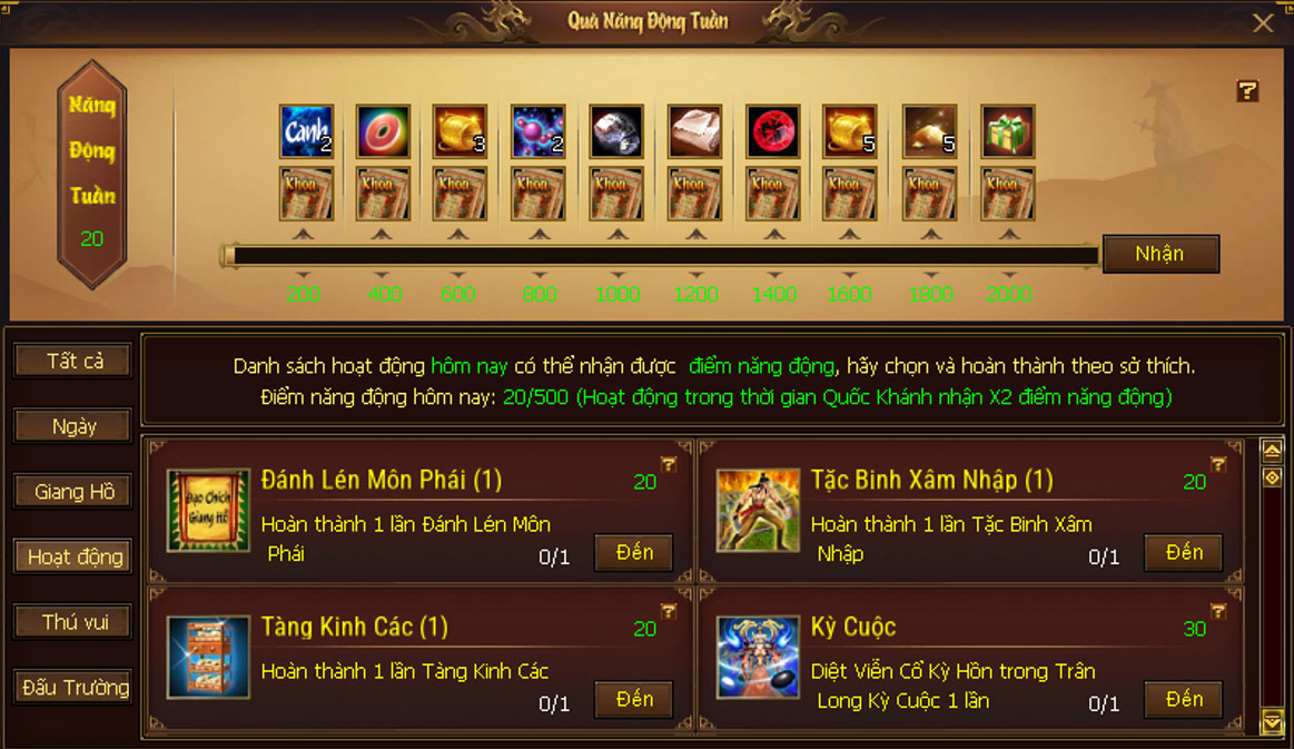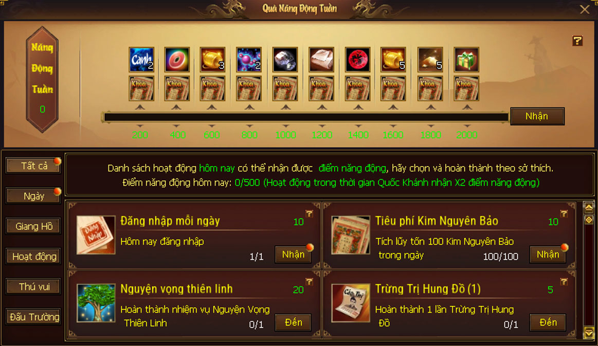 - Tại giao diện năng động tuần, các đại hiệp có thể kiểm tra các hoạt động trong ngày/trong tuần mà mình đã/chưa hoàn thành.