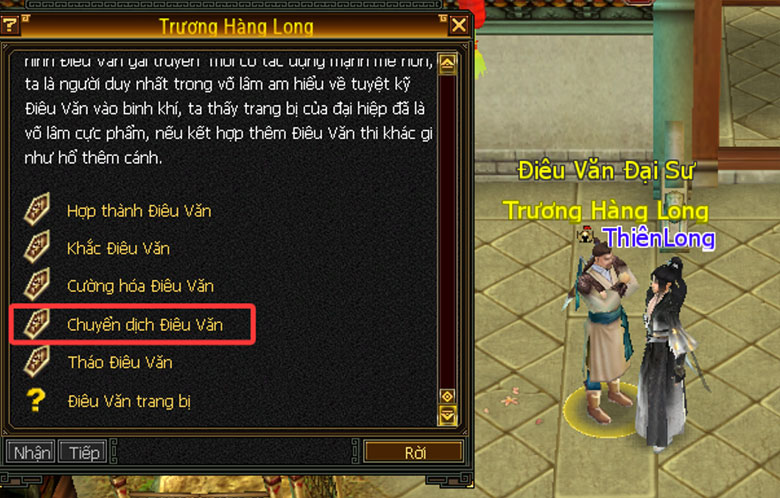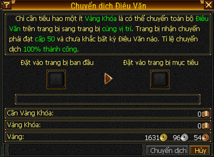- Có thể đem Điêu Văn thực khắc trên trang bị chuyển sang trang bị cùng bộ phận khác.
