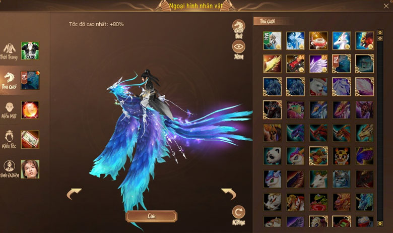 - Đại hiệp có thể thay đổi thời trang, thú cưỡi, kiểu mặt, kiểu tóc, màu tóc, ảnh đại diện.