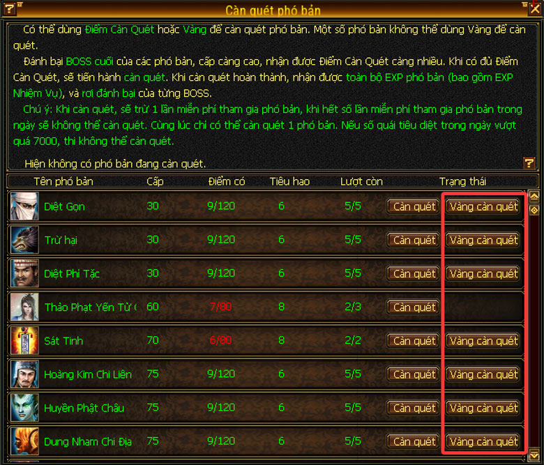 - Các phó bản có thể sử dụng càn quét bằng vàng: Diệt Gọn, Trừ Hại, Diệt Phỉ, Sát Tinh, Hoàng Kim Chi Liên, Huyền Phật Châu, Dung Nham Chi Địa.