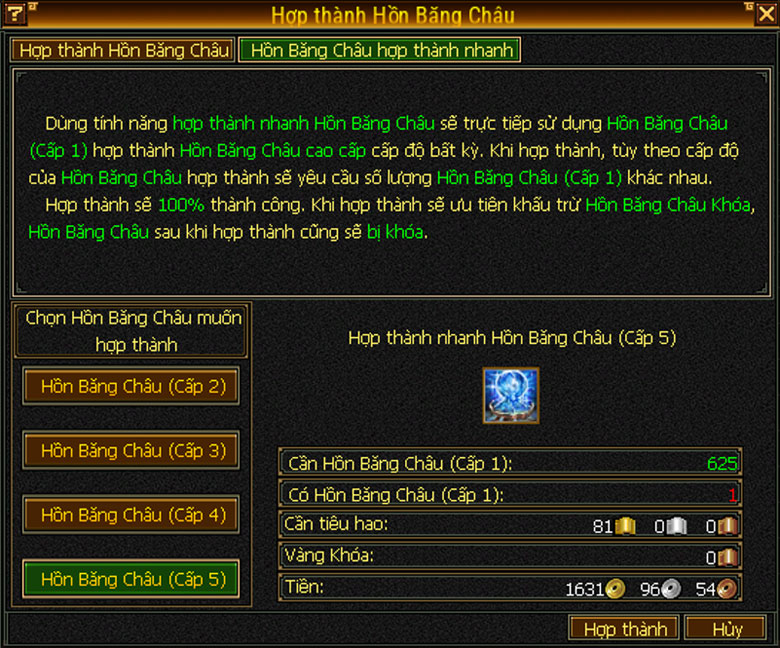 - Có thể dùng Hồn Băng Châu (Cấp 1) với số lượng khác nhau để ghép thành Hồn Băng Châu Cao Cấp ở mọi cấp độ.