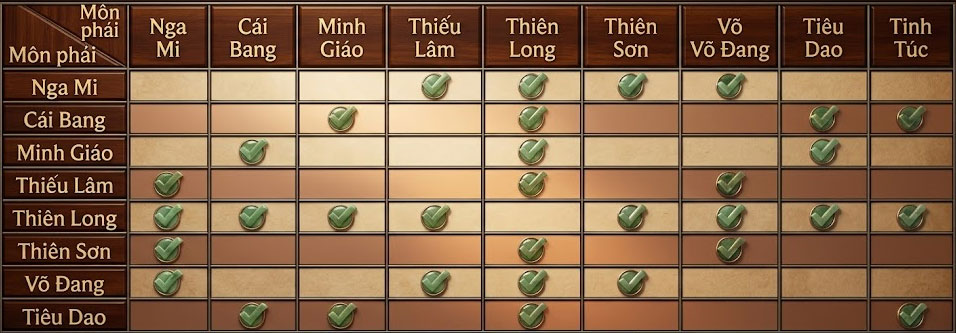 - Phạm vi chuyển đổi: Ví dụ: Nga Mi có thể chuyển qua Thiếu Lâm, Thiên Long, Thiên Sơn, Võ Đang và ngược lại.