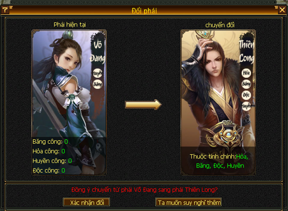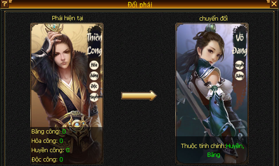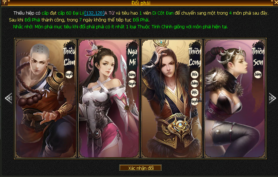 - Môn phái mục tiêu: Khi chuyển phái phải có ít nhất 1 loại thuộc tính chính trùng với môn phái hiện tại.