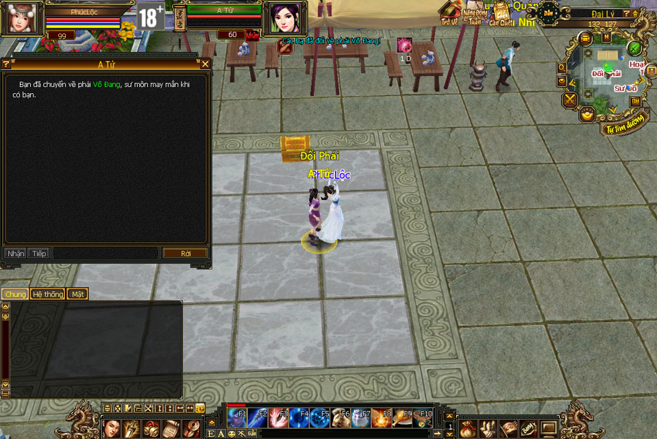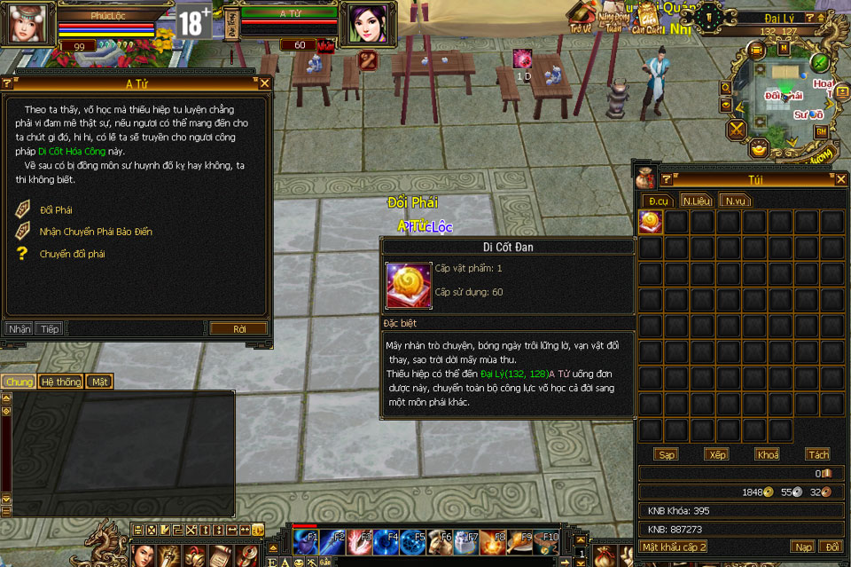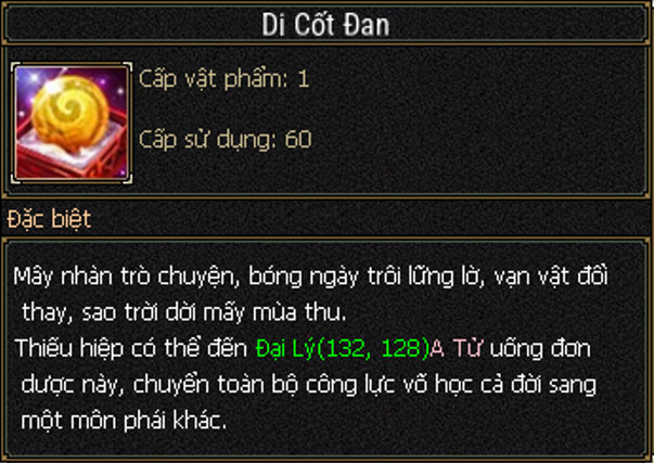 - Bước 1: Sau khi bảo trì cập nhật, Thiếu hiệp có thể mang theo 1 viên Di Cốt Đan đến gặp A Tử - Đại Lý (132,127) để tiến hành chuyển đổi.