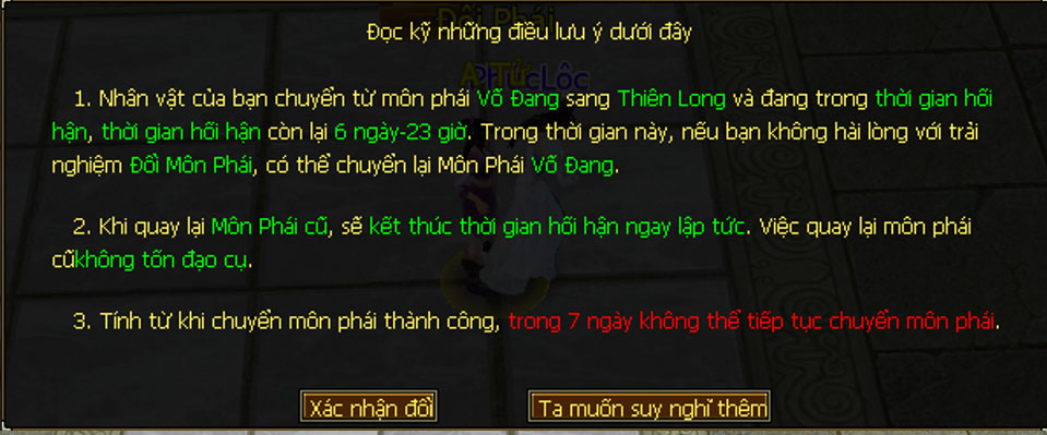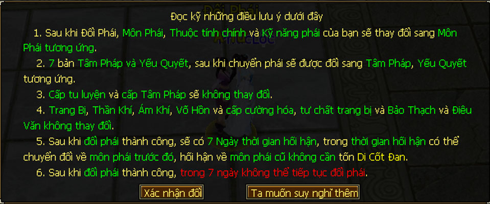 - Bước 3: Đọc kỹ yêu cầu chuyển đổi môn phái và xác nhận.