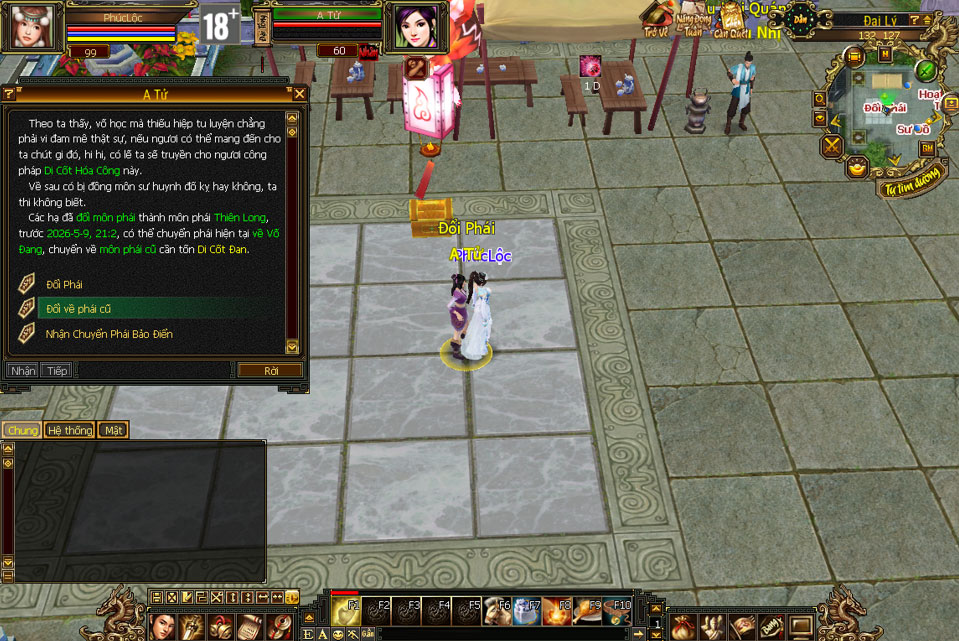 - Trong thời gian 7 ngày kể từ lúc chuyển phái, nếu muốn quay về môn phái cũ, đại hiệp có thể tìm gặp A Tử - Đại Lý (132,127) để chọn trở về.